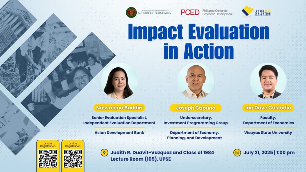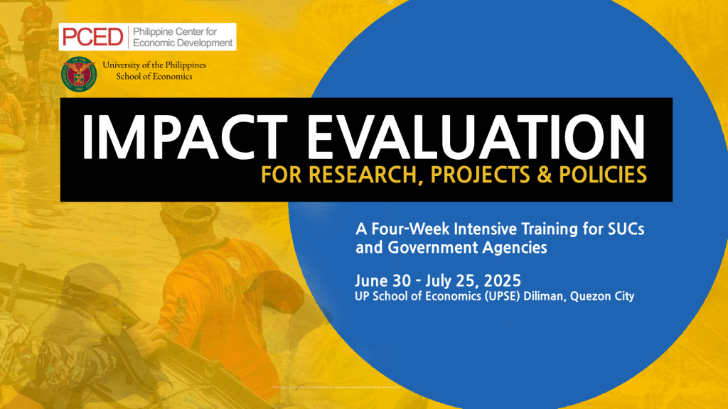 The Philippine Center for Economic Development (PCED) and the UP School of Economics (UPSE) are organizing the 2025 Training on Impact Evaluation for Research, Projects and Policies. This initiative is part of PCED’s and UPSE’s public service commitment to provide quality and relevant trainings to their stakeholders. The training will… Read More.