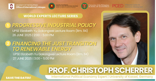 The 2025 World Expert Lecture Series (WELS), in collaboration with the UP School of Labor and Industrial Relations (UP SOLAIR) and the UP School of Economics (UPSE), is conducting two forums featuring Professor Emeritus Dr. Christoph Scherrer from Kassel Institute for Sustainability, University of Kassel in Kassel, Germany. Read More.